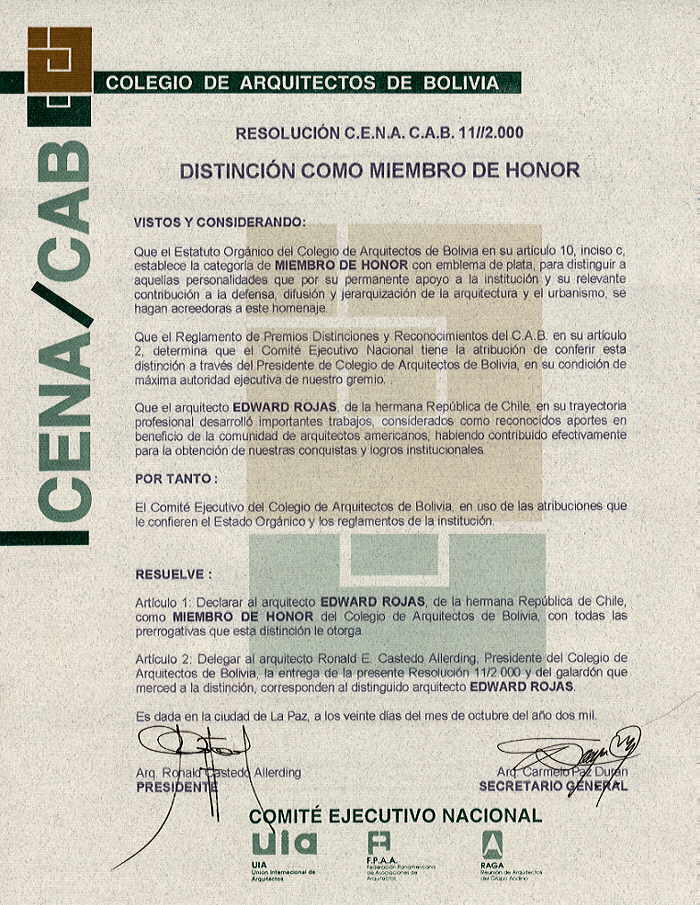 El 20 de octubre de 2000, día del aniversario de la Fundación de la ciudad de La Paz, Bolivia y en el marco de la VI Bienal de Arquitectura de La Paz, el Colegio de Arquitectos de Bolivia, resolvió distinguir como miembro de honor con emblema de plata, al arquitecto Edward Rojas, porque en su trayectoria profesional ha desarrollado importantes trabajos, considerados como reconocidos aportes en beneficio de la comunidad de arquitectos latinoamericanos.