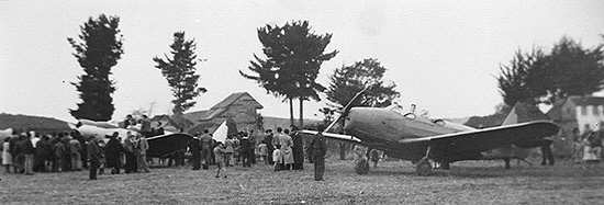 Vista parcial de las primeras aeronaves que llegaron a la inauguración de la pista de aterrizaje del aérodromo Gamboa en la ciudad de Castro en el año 1946.
